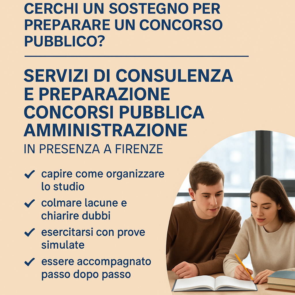 PROGETTI UNIVERSITARI FIRENZE grazie ad una lunga e proficua esperienza nel settore dei CONCORSI PUBBLICI, offre IN PRESENZA Assistenza e Formazione durante la Preparazione Concorsi Pubblica Amministrazione. Da tanti anni lo Studio si occupa di preparare le persone ad affrontare la totalità delle Prove previste nei Concorsi Pubblici con il massimo della competenza, specialmente in materie fondamentali come Diritto amministrativo e Diritto pubblico. Una volta iscritto a uno dei nostri corsi per la Preparazione Concorsi Pubblica Amministrazione verrai seguito e guidato costantemente da figure esperte, in grado di indirizzare il tuo percorso in tutte le fasi della selezione, per ottenere grazie al tuo impegno il massimo risultato.